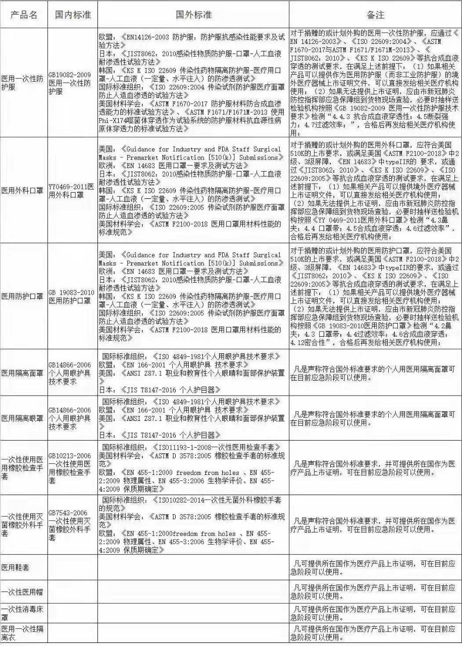 当前进口主要医用物资参考标准如下: